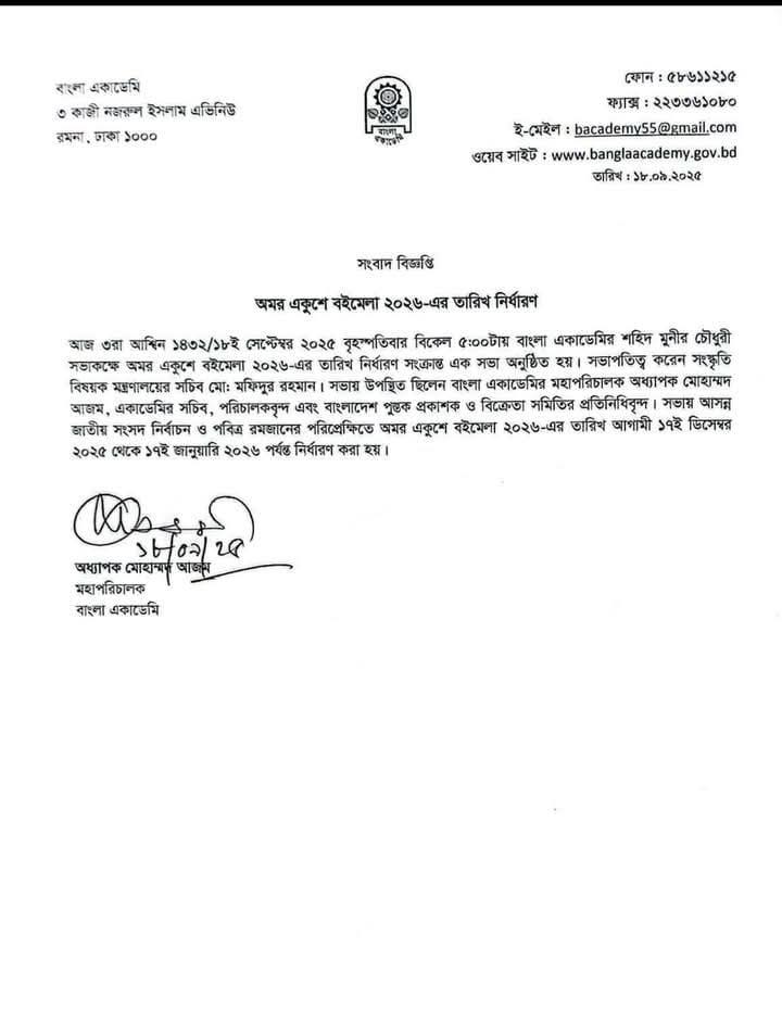 বৃহস্পতিবার (১৮ সেপ্টেম্বর) বাংলা একাডেমির শহীদ মুনির চৌধুরী সভাকক্ষে অমর একুশে বইমেলা-২০২৬ এর তারিখ নির্ধারণ সংক্রান্ত এক সভায় এ সিদ্ধান্ত নেওয়া হয়।